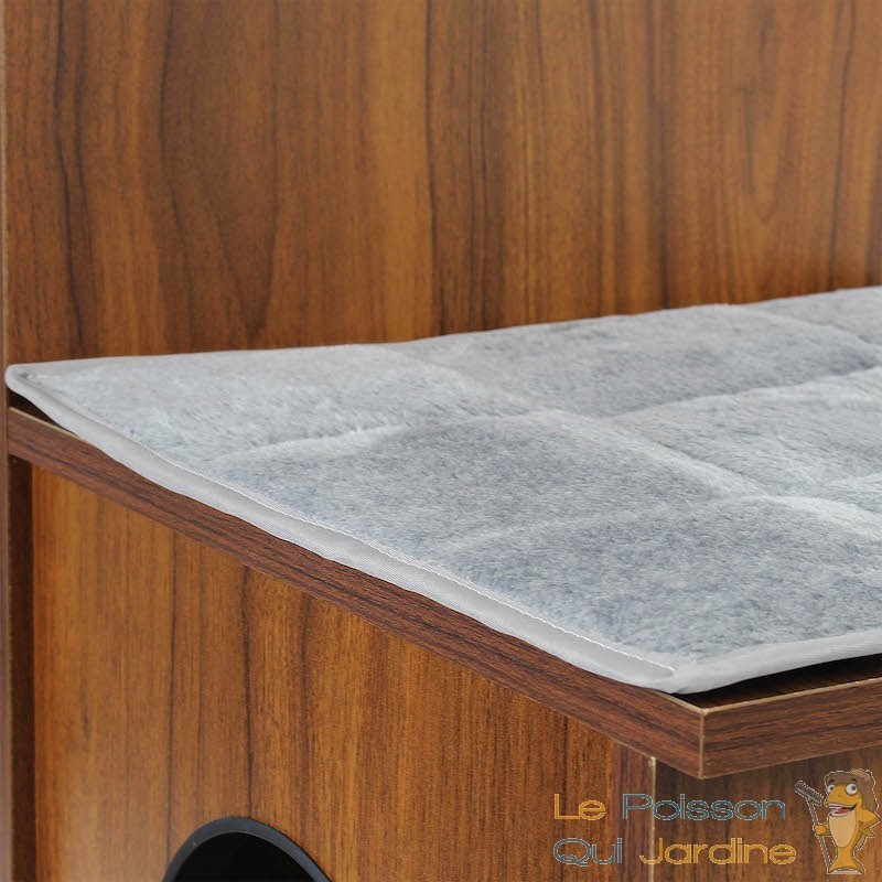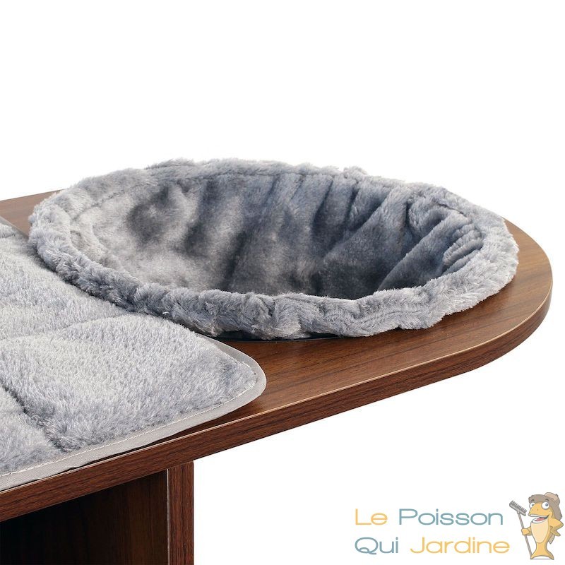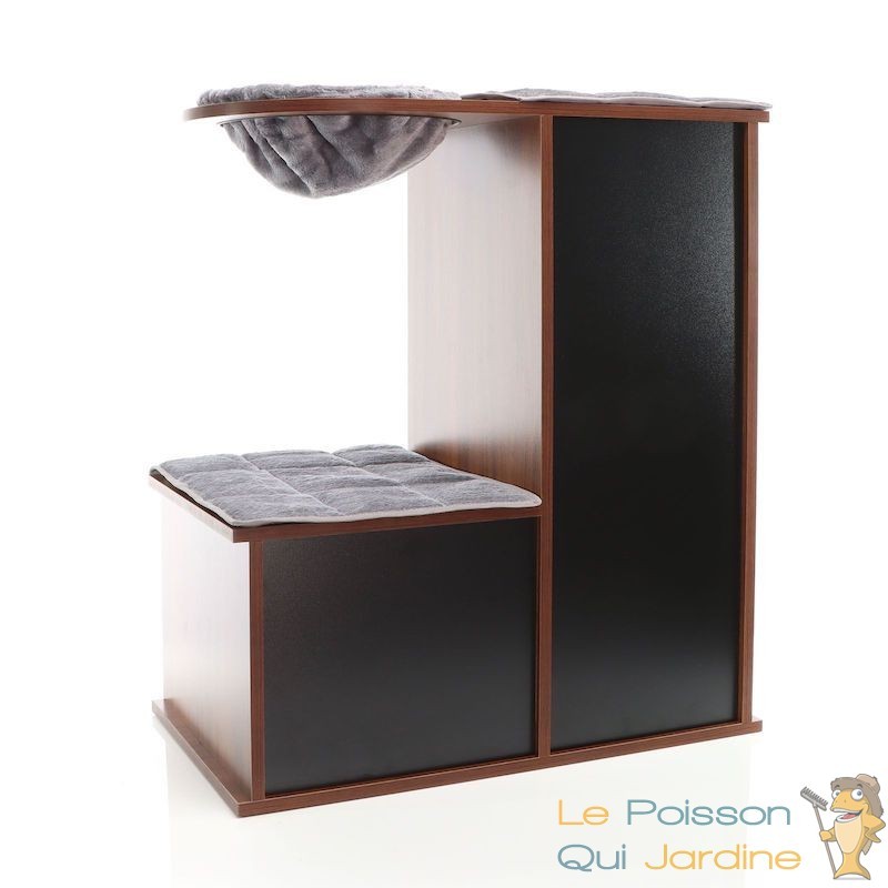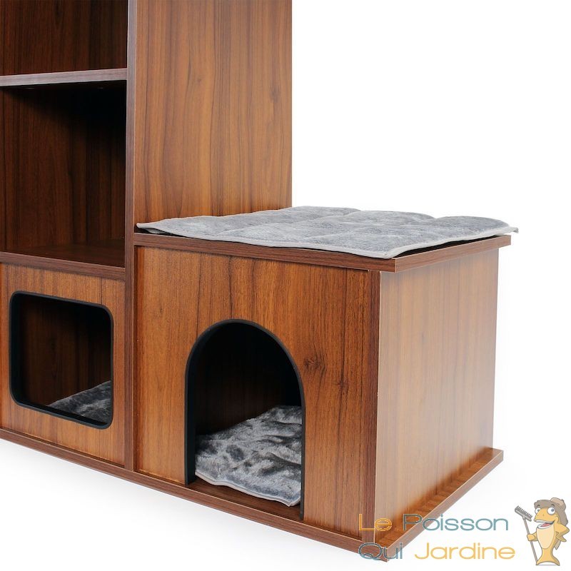 Au-dessus de l'un des antres, on trouve une surface de repos spacieuse munie d'un coussin très confortable. L'autre antre offre au chat la possibilité de grimper vers le haut et de découvrir deux casiers où il peut se cacher, se reposer ou observer la pièce.