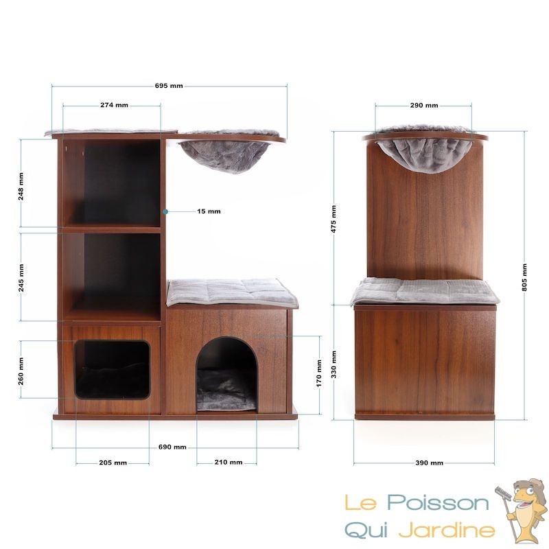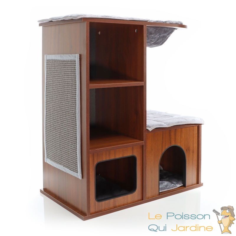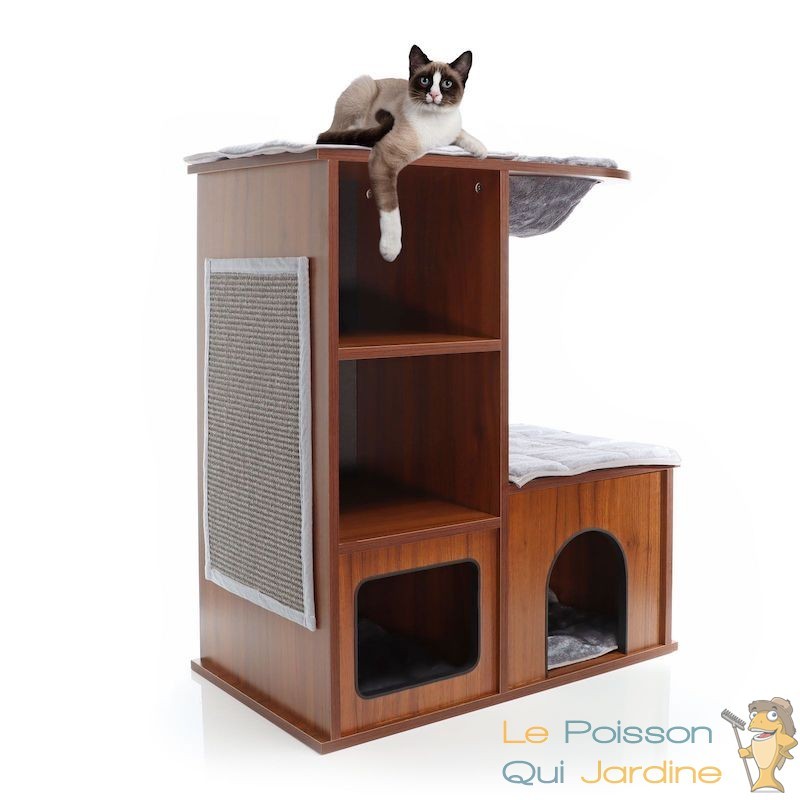 L'aménagement de cet espace pour les chats propose une variété d'activités et de zones confortables. La surface de repos spacieuse avec un coussin offre un lieu idéal pour la détente, tandis que l'autre antre encourage l'exploration avec la possibilité de grimper vers le haut. Les deux casiers offrent des espaces de cachette, de repos et d'observation, fournissant ainsi un environnement enrichissant pour le bien-être et le divertissement de votre chat.