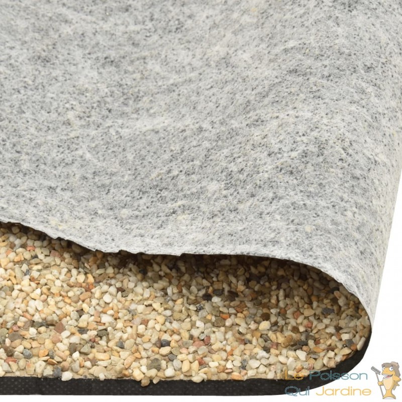 Le revêtement, habillé de gravier fin, s'intègre harmonieusement dans son environnement, créant ainsi un aspect naturel et authentique. Sa polyvalence est renforcée par sa capacité à être facilement découpé avec des ciseaux, permettant ainsi une adaptation précise aux dimensions spécifiques de chaque étang, quelle que soit sa forme ou sa taille.