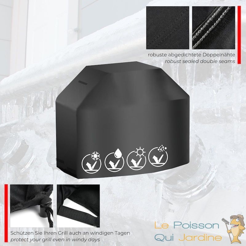 Revêtement résistant à l'eau : Le PVC utilisé pour cette housse est muni d'un revêtement résistant à l'eau, qui empêche l'eau de pénétrer à l'intérieur de la housse et protège ainsi efficacement le barbecue de l'humidité.