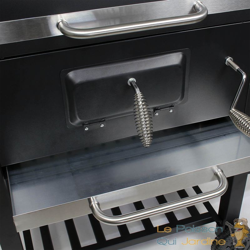 Doté d’une grille de cuisson spacieuse et d’une grille de maintien au chaud, ce barbecue permet de préparer plusieurs types d’aliments en même temps, tout en gardant vos mets à la température idéale. La manivelle frontale permet d’ajuster avec précision la hauteur de la grille à charbon, vous offrant ainsi un contrôle total sur l’intensité de la cuisson. Que vous souhaitiez saisir une viande rapidement ou laisser mijoter des légumes, vous adaptez la chaleur selon vos envies.