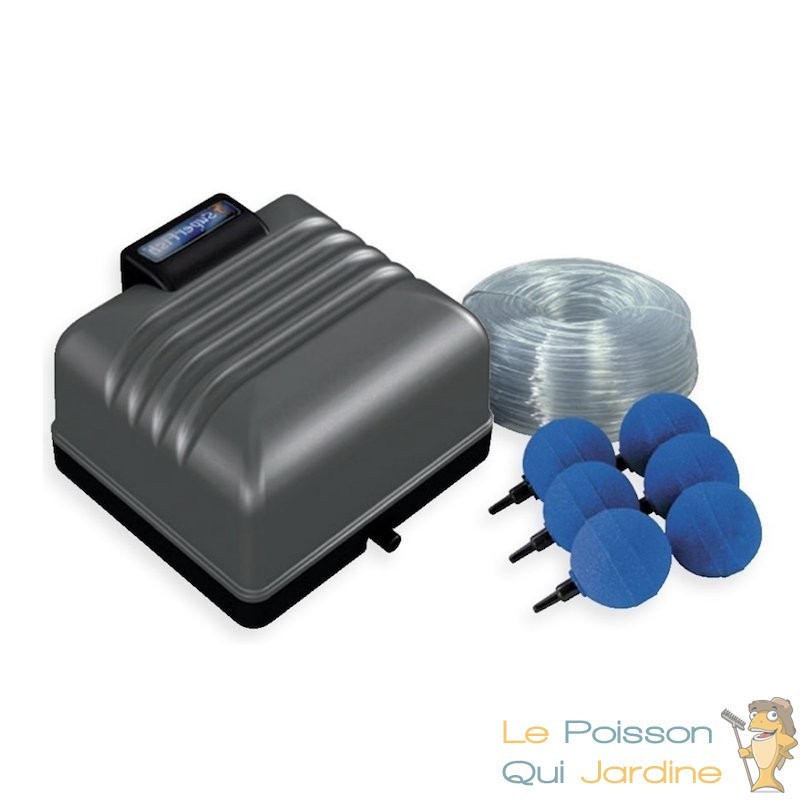 Kit pompe à air ou aérateur pour bassin de jardin et étangs extérieurs. Son débit d'air et de 1200 l/h.
