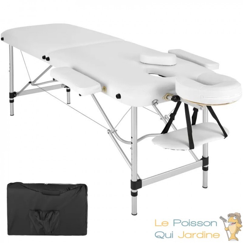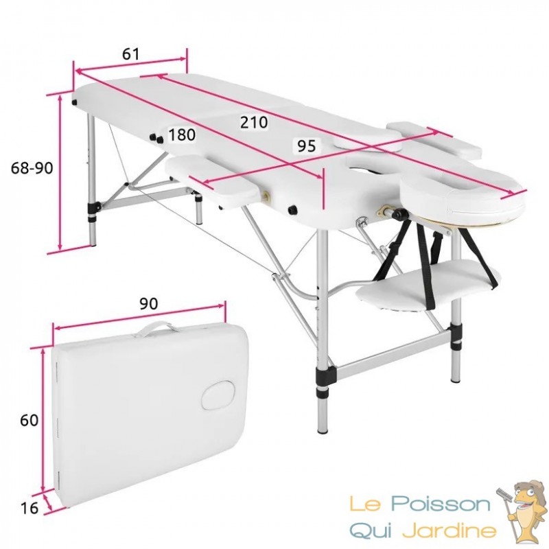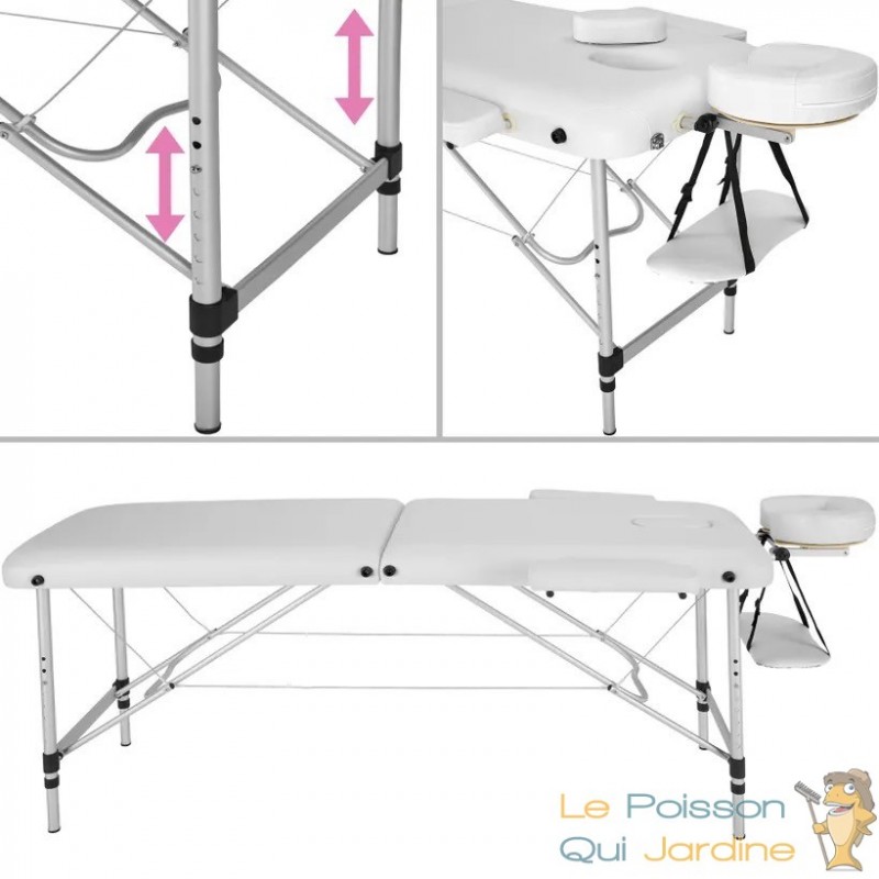 La table de massage se compose d'un cadre en aluminium robuste qui garantit une stabilité et une durabilité optimales. Son rembourrage en mousse de 4 cm d'épaisseur offre un confort moelleux à chaque séance de massage. De plus, le revêtement en similicuir de haute qualité est résistant à l'huile et à l'eau, ce qui facilite grandement le nettoyage et l'entretien de la table.
