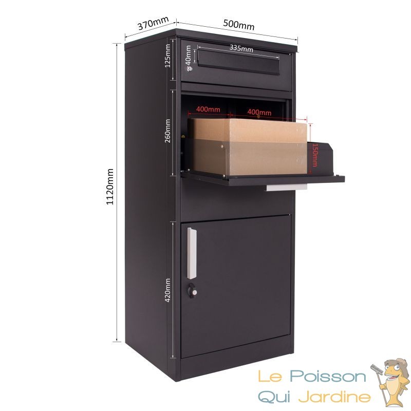 La boîte à colis verrouillable noire est conçue pour garantir une protection maximale de vos colis. Sa grande capacité de stockage permet d'accueillir des colis jusqu'à une taille de 150 x 400 x 400 mm, idéale pour les paquets de taille standard souvent livrés par les services de messagerie. Grâce à son système de rangement ingénieux, avec une étagère intermédiaire et un mécanisme de fermeture sécurisé, vos colis sont en sécurité dès leur arrivée. Le rabat supérieur de la boîte s’ouvre facilement pour insérer le colis, et dès qu'il est refermé, il glisse de manière sécurisée dans la partie inférieure, où il est protégé contre tout risque de vol ou d'humidité.