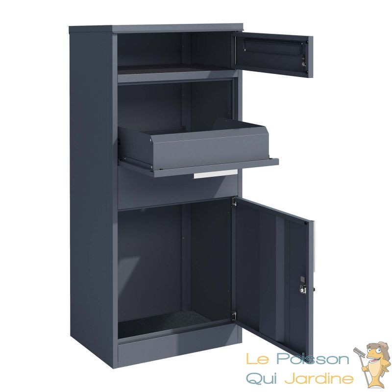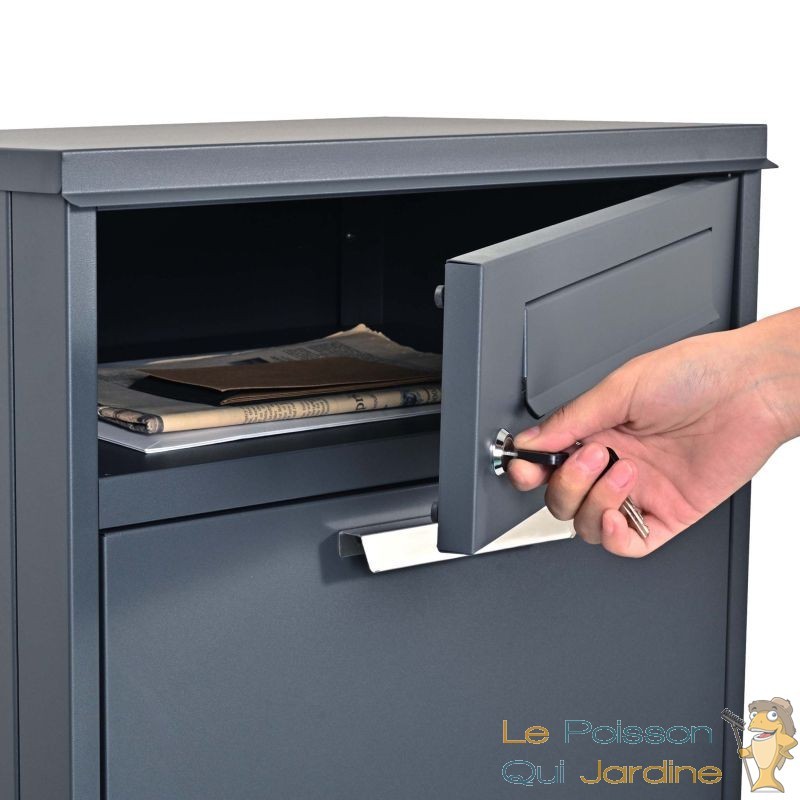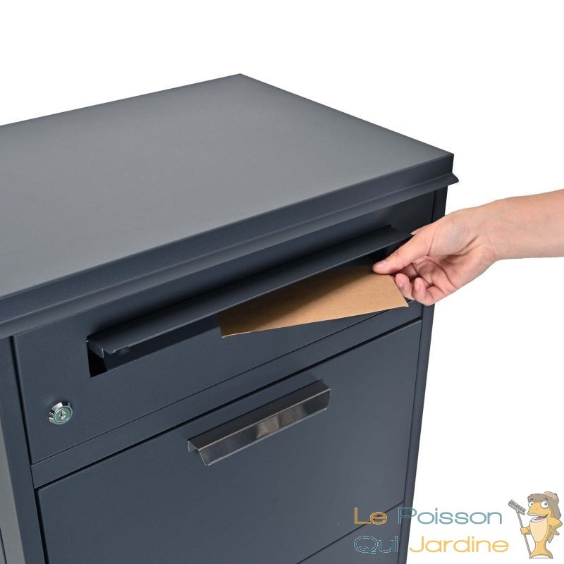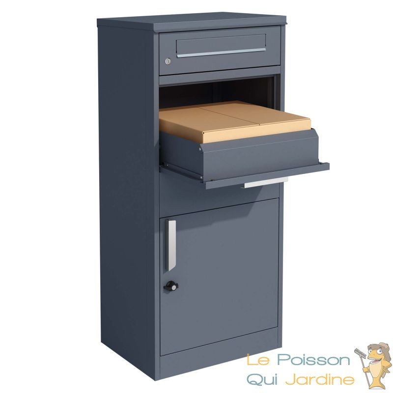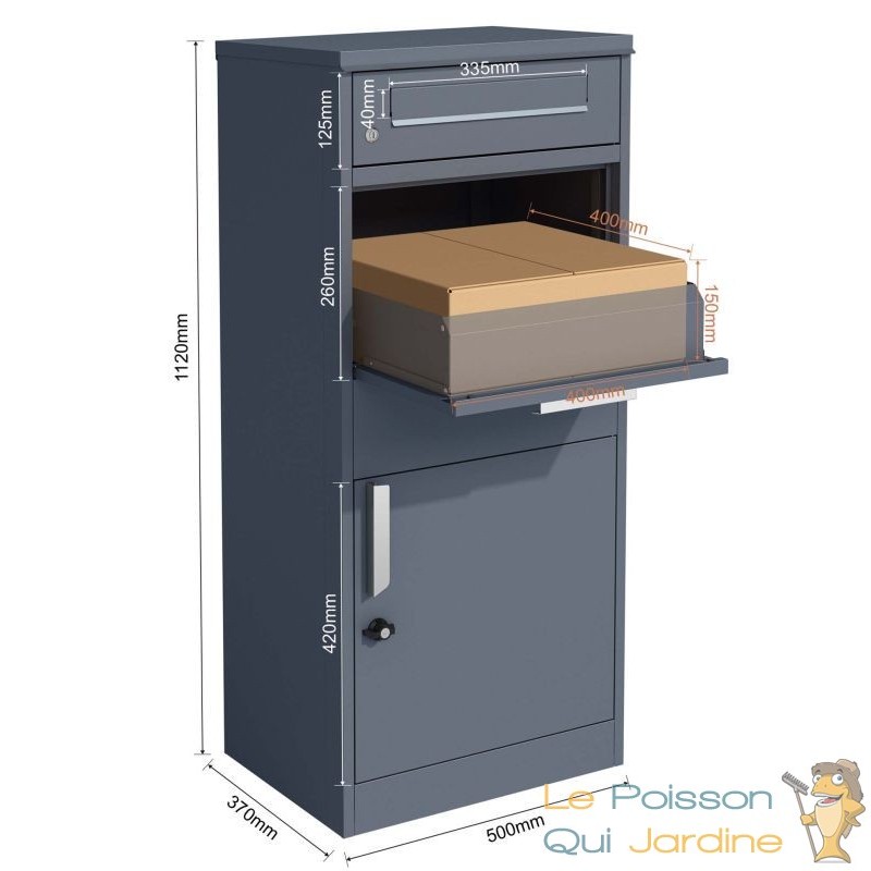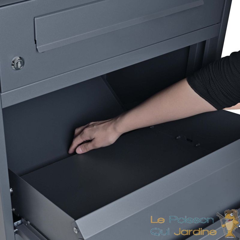 La boîte à colis verrouillable Gris Anthracite est conçue pour garantir une protection maximale de vos colis. Sa grande capacité de stockage permet d'accueillir des colis jusqu'à une taille de 150 x 400 x 400 mm, idéale pour les paquets de taille standard souvent livrés par les services de messagerie. Grâce à son système de rangement ingénieux, avec une étagère intermédiaire et un mécanisme de fermeture sécurisé, vos colis sont en sécurité dès leur arrivée. Le rabat supérieur de la boîte s’ouvre facilement pour insérer le colis, et dès qu'il est refermé, il glisse de manière sécurisée dans la partie inférieure, où il est protégé contre tout risque de vol ou d'humidité.