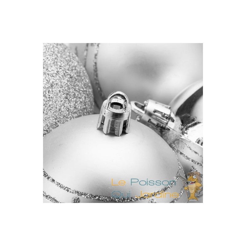 Attaches : Chaque boule de Noël est généralement munie d'une petite attache en métal ou en plastique sur le dessus, permettant de l'accrocher facilement au sapin de Noël. Certaines boules sont même vendues avec des cordons ou des rubans assortis pour une fixation élégante.