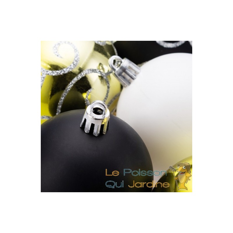 Attaches : Chaque boule de Noël est généralement munie d'une petite attache en métal ou en plastique sur le dessus, permettant de l'accrocher facilement au sapin de Noël. Certaines boules sont même vendues avec des cordons ou des rubans assortis pour une fixation élégante.