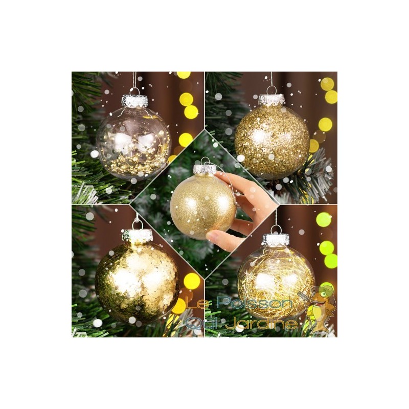 Décoration : Les boules de Noël sont décorées de diverses manières. Les plus courantes sont celles recouvertes de paillettes, de peintures brillantes et de motifs festifs. Les boules de Noël en verre peuvent également être transparentes ou dépolies, ce qui permet de voir l'intérieur ou de créer un effet de givre.