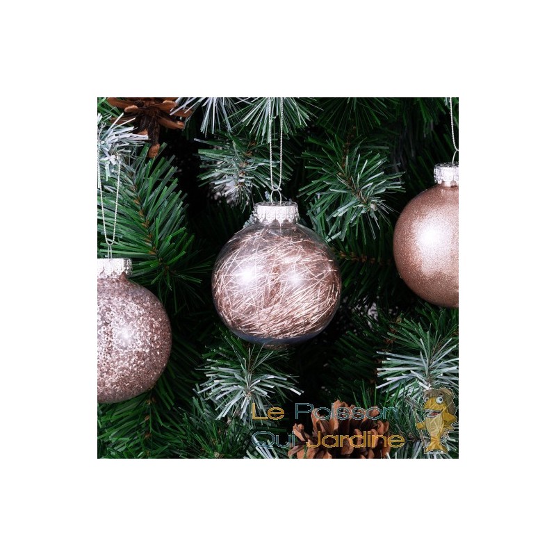 Décoration : Les boules de Noël sont décorées de diverses manières. Les plus courantes sont celles recouvertes de paillettes, de peintures brillantes et de motifs festifs. Les boules de Noël en verre peuvent également être transparentes ou dépolies, ce qui permet de voir l'intérieur ou de créer un effet de givre.