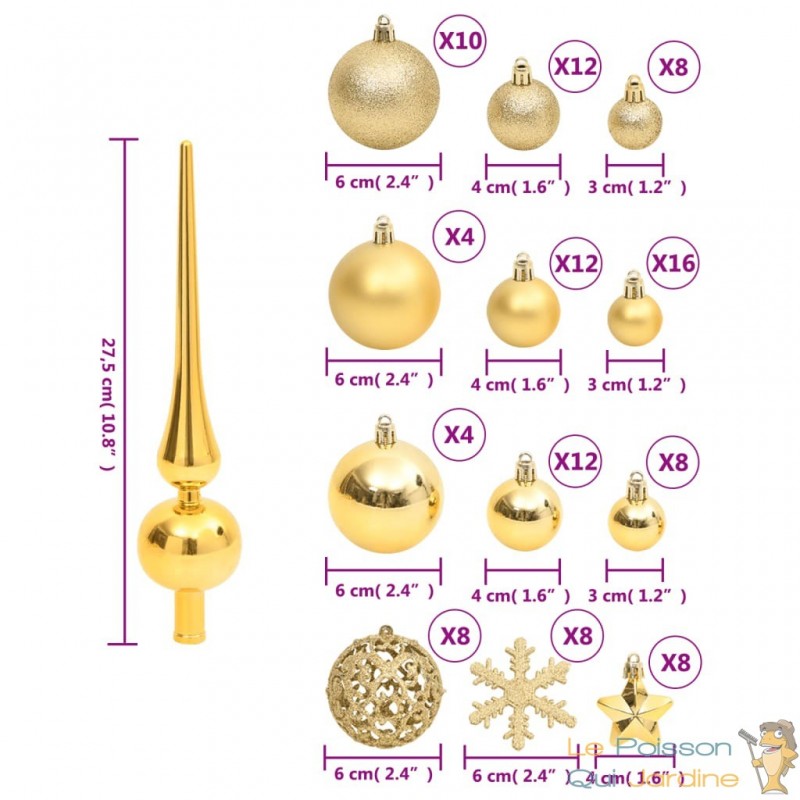 Cette collection de boules de Noël propose une variété de styles et de tailles pour répondre à vos préférences. Elle inclut des boules de trois diamètres différents (3 cm, 4 cm et 6 cm), ainsi que des flocons de neige, des étoiles et un sommet pour votre sapin. De plus, ces boules se déclinent en quatre styles distincts : mat, pailleté, brillant et ajouré, offrant une diversité de choix pour créer une décoration unique.