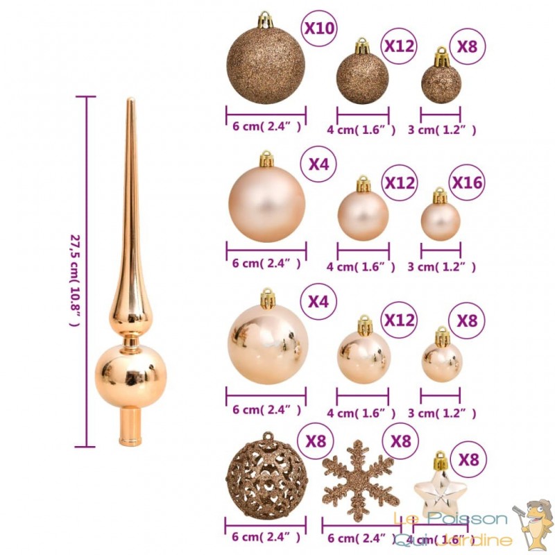 Cette collection de boules de Noël propose une variété de styles et de tailles pour répondre à vos préférences. Elle inclut des boules de trois diamètres différents (3 cm, 4 cm et 6 cm), ainsi que des flocons de neige, des étoiles et un sommet pour votre sapin. De plus, ces boules se déclinent en quatre styles distincts : mat, pailleté, brillant et ajouré, offrant une diversité de choix pour créer une décoration unique.