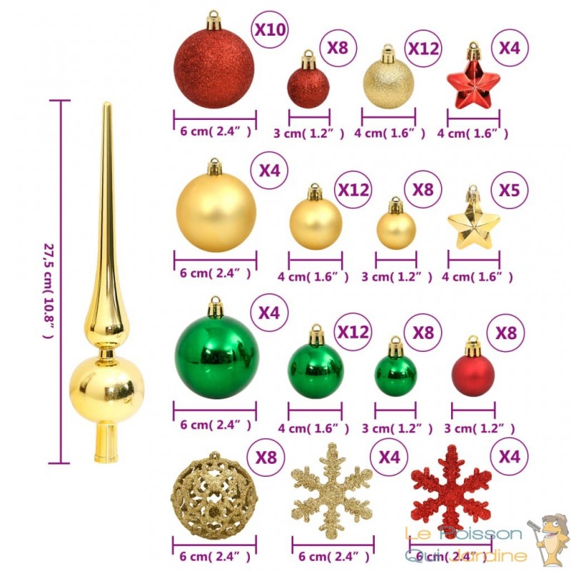 Cette collection de boules de Noël propose une variété de styles et de tailles pour répondre à vos préférences. Elle inclut des boules de trois diamètres différents (3 cm, 4 cm et 6 cm), ainsi que des flocons de neige, des étoiles et un sommet pour votre sapin. De plus, ces boules se déclinent en quatre styles distincts : mat, pailleté, brillant et ajouré, offrant une diversité de choix pour créer une décoration unique.