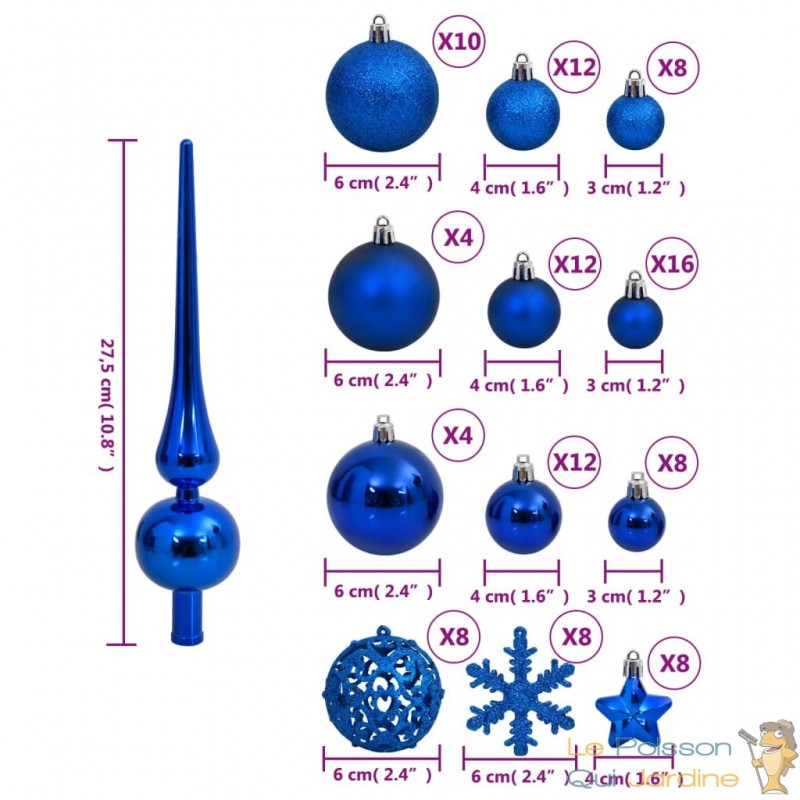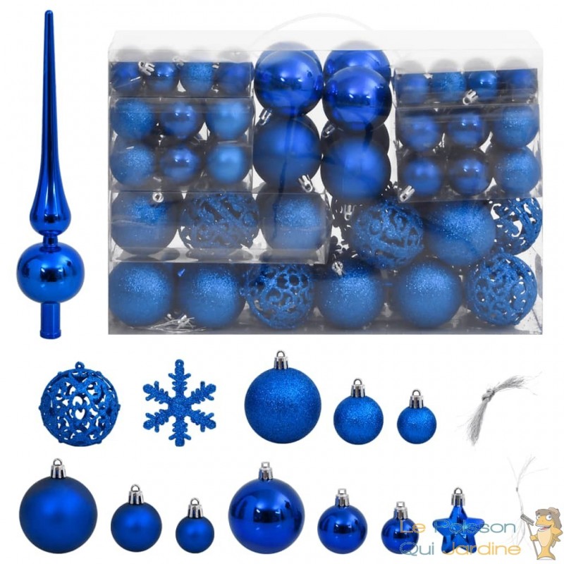 Cette collection de boules de Noël propose une variété de styles et de tailles pour répondre à vos préférences. Elle inclut des boules de trois diamètres différents (3 cm, 4 cm et 6 cm), ainsi que des flocons de neige, des étoiles et un sommet pour votre sapin. De plus, ces boules se déclinent en quatre styles distincts : mat, pailleté, brillant et ajouré, offrant une diversité de choix pour créer une décoration unique.