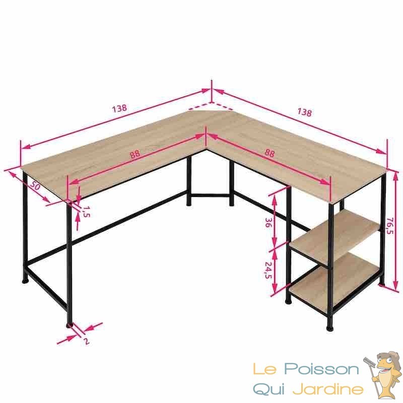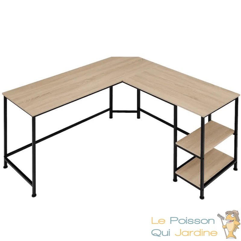 La forme en L du bureau offre une utilisation pratique de l'espace. Sa faible profondeur permet de l'installer même dans les espaces restreints, tout en offrant une surface de travail suffisante pour vos besoins quotidiens. De plus, les deux étagères situées sur le côté du bureau vous permettent de garder à portée de main vos dossiers, livres et accessoires essentiels, favorisant ainsi une meilleure organisation et productivité.