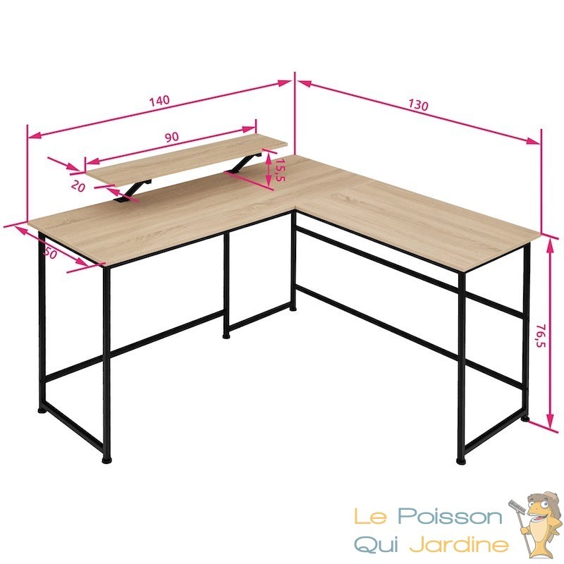Avec ses dimensions totales d'environ 140 x 130 x 76,5 cm, ce bureau offre une surface généreuse pour accomplir vos tâches quotidiennes. La profondeur de la plaque de bureau est d'environ 50 cm, vous offrant ainsi suffisamment d'espace pour travailler confortablement.
