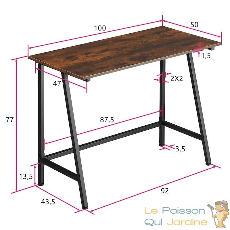 Les dimensions totales du bureau sont d'environ 100 x 50 x 77 cm, offrant ainsi un espace de travail suffisant pour vos besoins quotidiens. Le panneau de particules d'une épaisseur d'environ 1,5 cm garantit la robustesse et la durabilité du bureau.