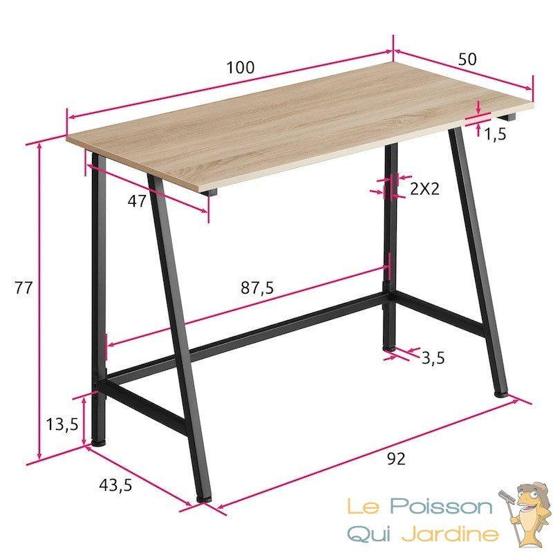 Les dimensions totales du bureau sont d'environ 100 x 50 x 77 cm, offrant ainsi un espace de travail suffisant pour vos besoins quotidiens.