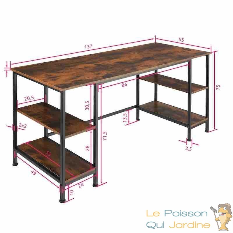 Les dimensions totales de ce bureau sont d'environ 137 x 55 x 75 cm, offrant ainsi un espace de travail généreux pour vos besoins. La plaque de table spacieuse mesure environ 137 x 55 cm, offrant amplement d'espace pour votre ordinateur, vos documents et autres équipements. Les compartiments latéraux supérieurs mesurent environ 20,5 x 53 x 30,5 cm, tandis que les compartiments latéraux inférieurs mesurent environ 20,5 x 53 x 28 cm, offrant un espace de rangement supplémentaire.