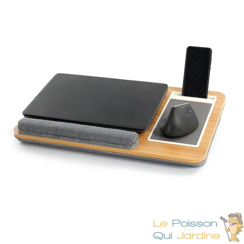 La sécurité est primordiale, c'est pourquoi le plateau est équipé d'un bord antidérapant pour maintenir votre ordinateur portable en place. De plus, un tapis de souris intégré à droite de l'ordinateur portable complète cet espace de travail mobile.