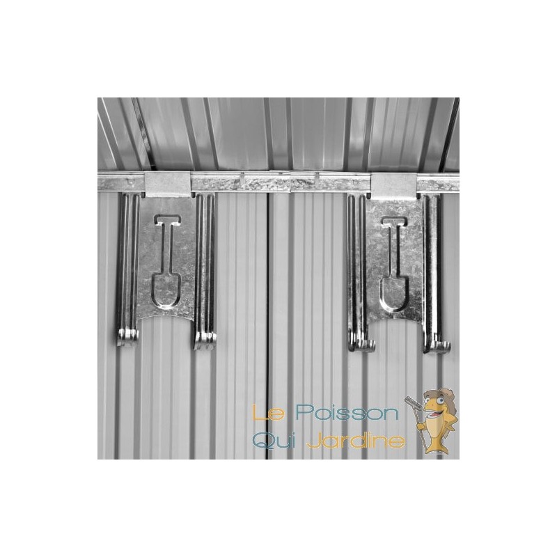 Un autre avantage majeur de cet abri de jardin est la présence de crochets supplémentaires capables de supporter une charge de 15 kg chacun. Ces crochets facilitent grandement l'organisation de vos outils de jardin tels que pelles, râteaux, sécateurs, scies, et bien d'autres. Vous pouvez les accrocher à ces crochets, les gardant ainsi à portée de main lorsque vous en avez besoin.