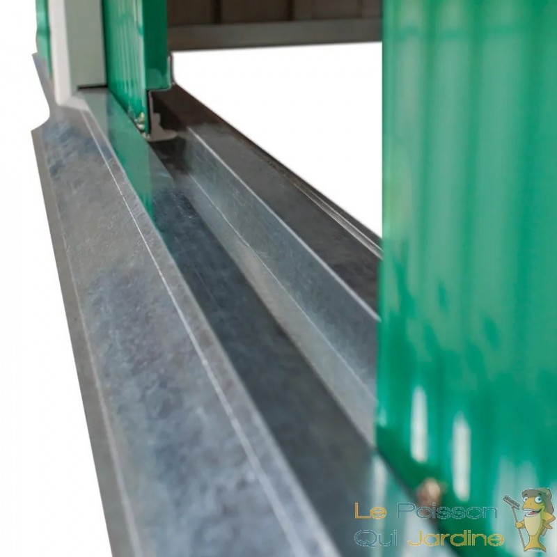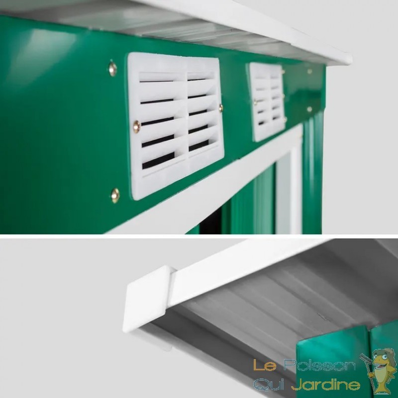 L'abri est équipé d'une porte coulissante qui facilite grandement l'accès à vos biens stockés. Vous pouvez donc rapidement trouver ce dont vous avez besoin sans tracas. De plus, les grilles de ventilation situées sur le toit assurent une circulation d'air adéquate à l'intérieur de l'abri, ce qui est essentiel pour éviter l'humidité et la condensation qui pourraient endommager vos objets.