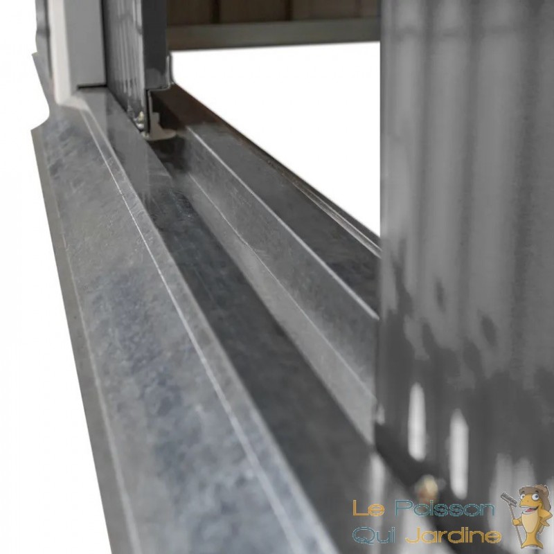 La fondation solide fournie avec l'abri garantit une base robuste, assurant ainsi sa stabilité et sa durabilité à long terme. Les coins du toit en métal sont munis d'une protection de bords, ce qui ajoute une couche supplémentaire de sécurité pour vos biens stockés, en évitant tout risque de dommages dus à des bords tranchants.