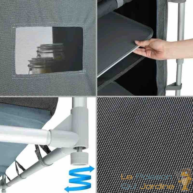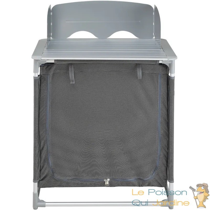Le plan de travail de cette desserte de cuisine est résistant à la chaleur et protégé du vent, vous permettant ainsi de cuisiner en toute tranquillité. Son grand compartiment de rangement est divisé en deux niveaux, offrant amplement d'espace pour organiser vos accessoires de cuisine, ustensiles et ingrédients. Le dos du meuble est en tissu maillé, assurant une bonne aération pour éviter l'accumulation d'humidité.