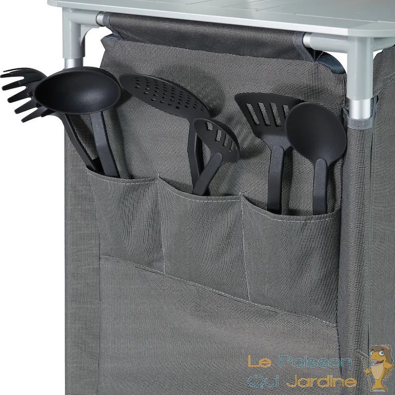 Les poches extérieures vous permettent de garder vos couverts à portée de main. De plus, les pieds réglables en hauteur vous permettent de stabiliser la cuisine sur tous types de sols, même en présence d'irrégularités.