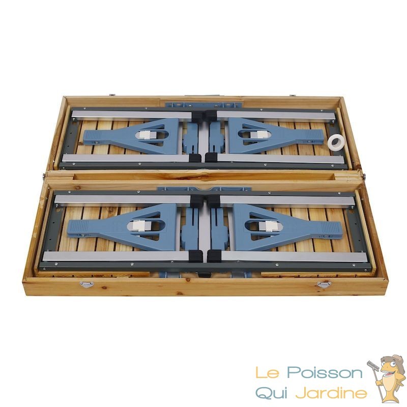 La surface de la table ainsi que les sièges sont fabriqués en bois de sapin, offrant à la fois une esthétique chaleureuse et une robustesse remarquable. De plus, les barres en aluminium ajoutent une stabilité supplémentaire à l'ensemble, vous permettant de vous installer en toute confiance.
