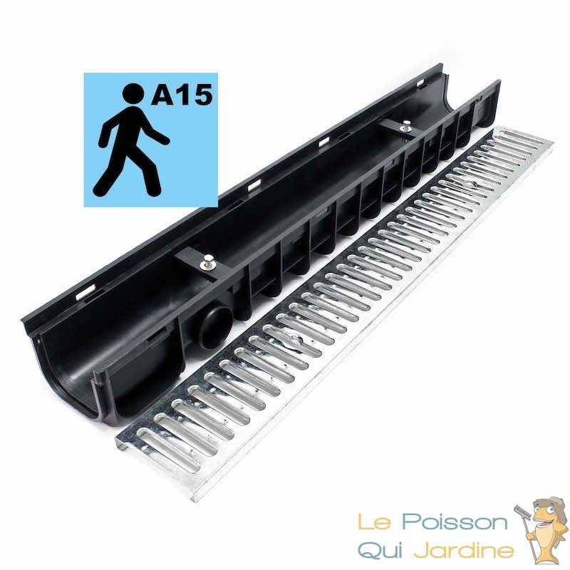 Le caniveau est fabriqué en plastique de haute qualité, ce qui lui confère une grande robustesse et une longévité exceptionnelle. La grille de recouvrement est en acier galvanisé, garantissant une protection solide contre les charges et les dommages.