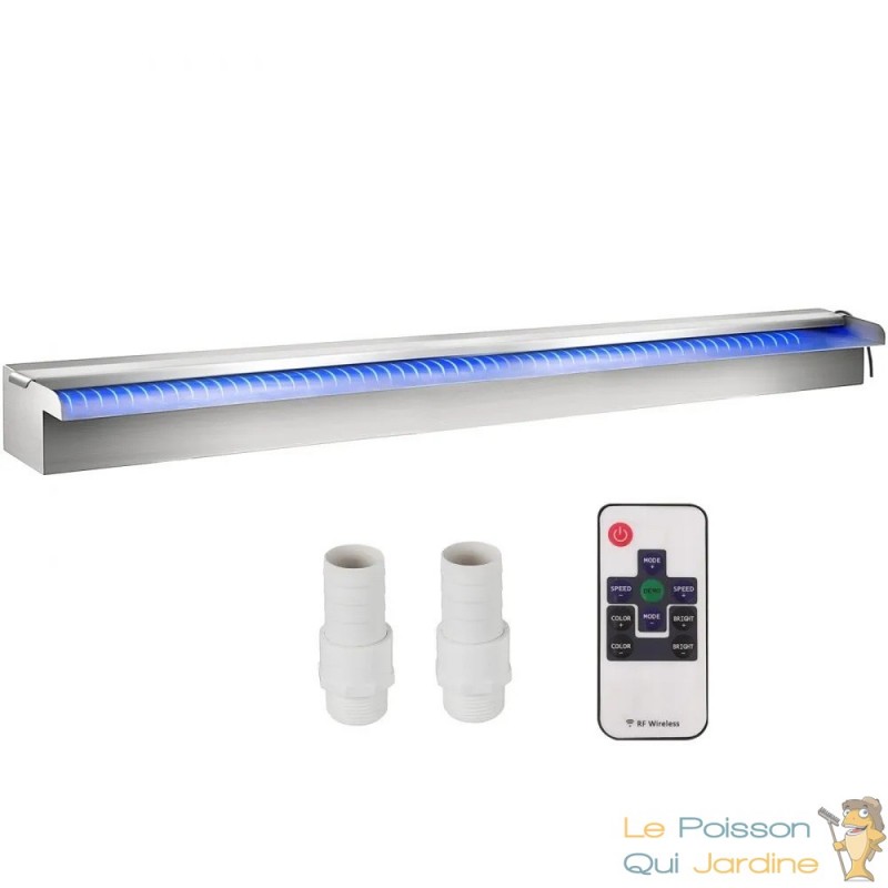 Cette lame d'eau monumentale de 150 cm est la pièce maîtresse idéale pour un bassin moderne ou une piscine. Au-delà de l'aspect visuel, elle joue un rôle écologique majeur : en créant un remous constant, elle enrichit l'eau en oxygène, essentiel à la santé de vos carpes Koï et esturgeons. Conseil d'expert : Sa fabrication en inox haute qualité la rend totalement compatible avec les piscines traitées au chlore. Pour un rendu "rideau de soie" impeccable, veillez à bien choisir votre pompe en fonction de la hauteur de chute.