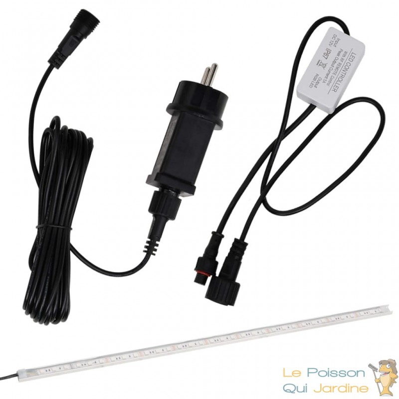 Le câble électrique de la barre d'éclairage LED est d'environ 8 mètres. Ce qui vous permet de pouvoir brancher votre cascade sur une prise éloignée du bassin. Par exemple, sur une multiprise prévu à cet effet.