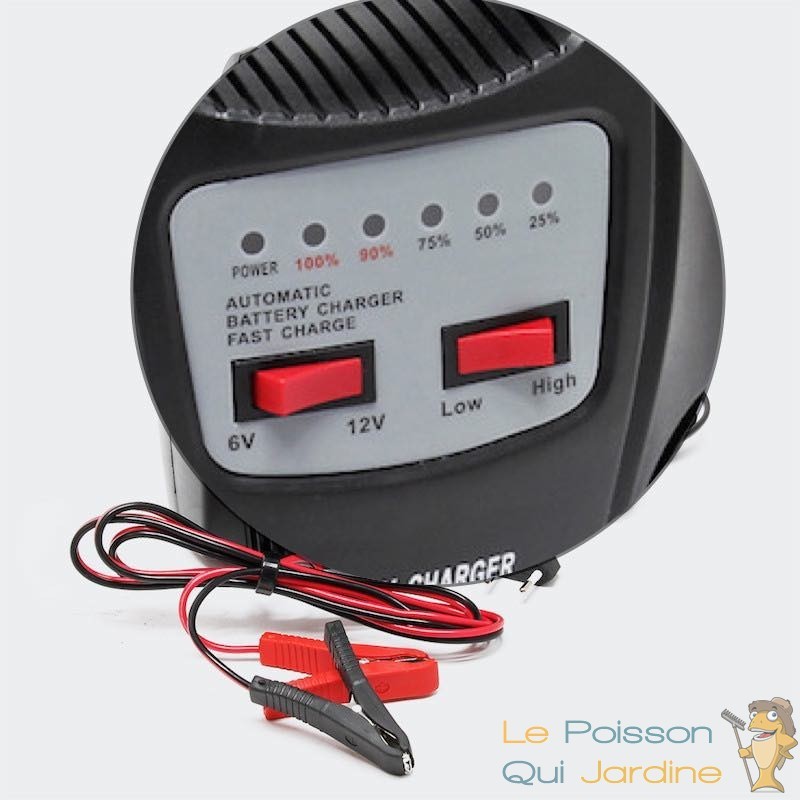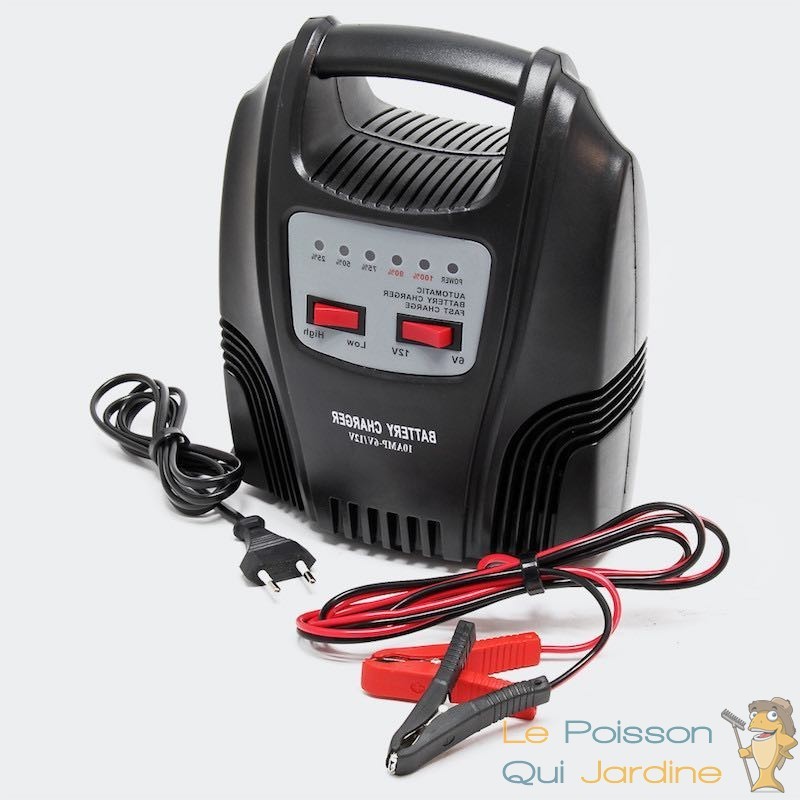 Chargeur de batterie mobile pour des batteries de 6 à 12 volts, 120W de puissance électrique et de 10 ampères.