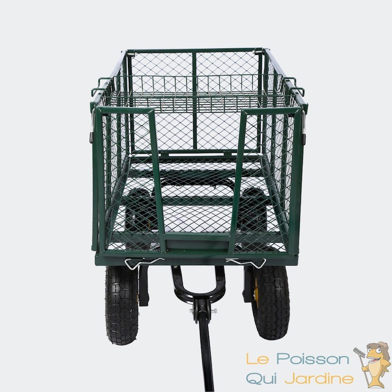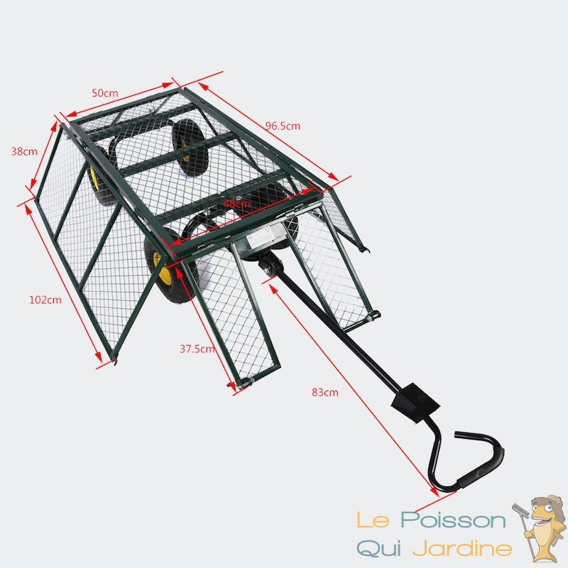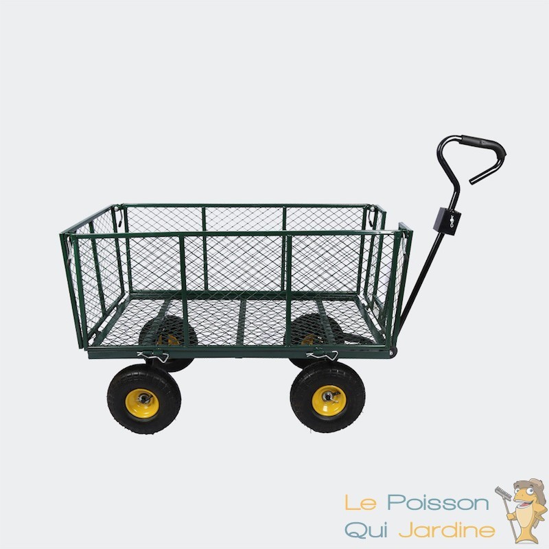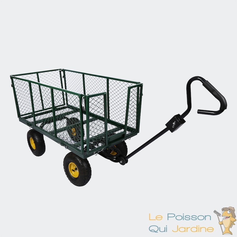 Nous vous proposons une remorque à main ou chariot pour le jardin pour charger des déchets verts, des bûches ou de l'herbe coupée ou encore pour transporter facilement les outils de jardin.