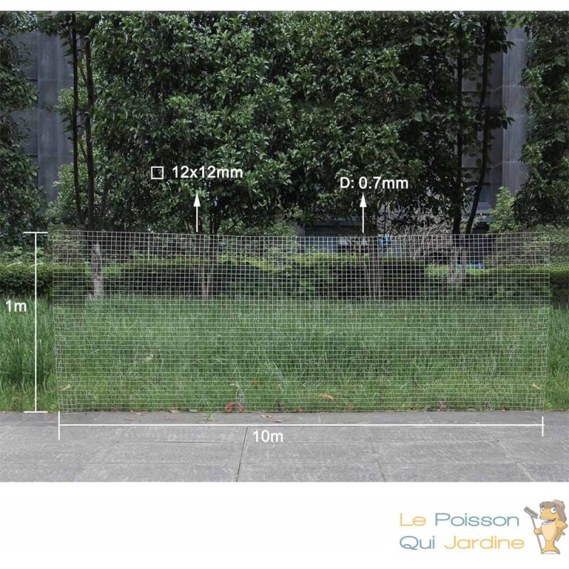 Vous recevrez un rouleau de grillage de 10 mètres de longueur et de un mètre de hauteur et dont la maille mesure 12 mm. L'épaisseur du grillage est de 0,75mm.
