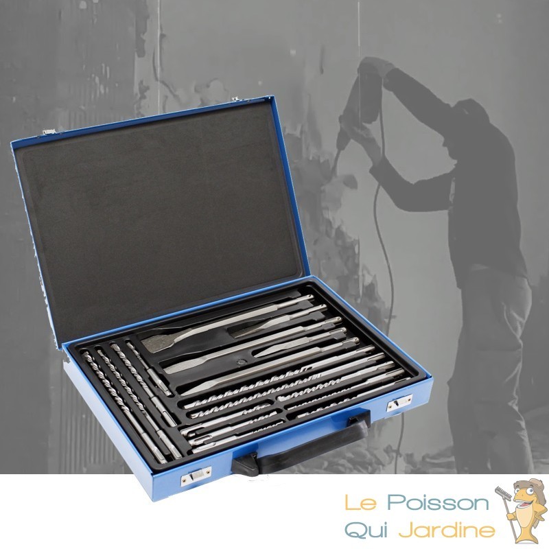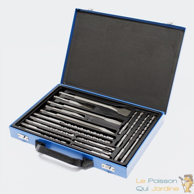 Nous vous proposons ce coffret complet de 17 mèches, forets et burins pour marteau-piqueur perforateur avec une connexion SDS. Il est très pratique et peu encombrant.