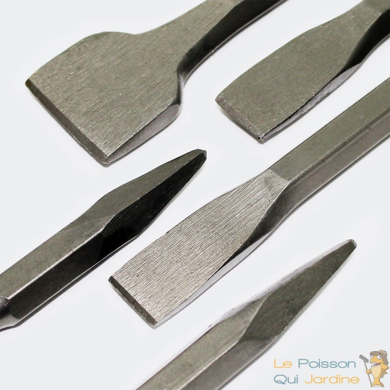 Dans le lot de cinq burins, vous retrouverez trois burins plats et deux burins pointus. Sachez que les burins plats peuvent être réaffûtés et aiguisés quand ils sont usés. Leur longévité est alors augmentée de plusieurs années.