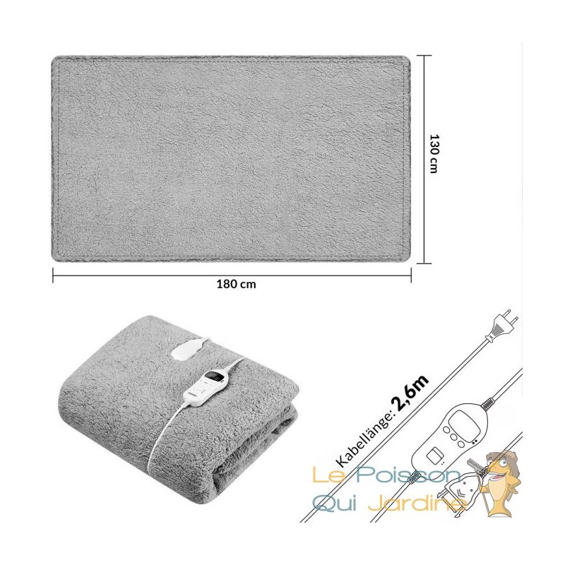 Sur le plan technique, l'alimentation est de 220-240V/50Hz avec une puissance de 120W. Le matériau utilisé est le polyester à 100%, et les dimensions généreuses de la couverture sont de 180 x 130 cm. Profitez du confort et de la sécurité offerts par notre couverture chauffante pendant les jours les plus froids de l'année.