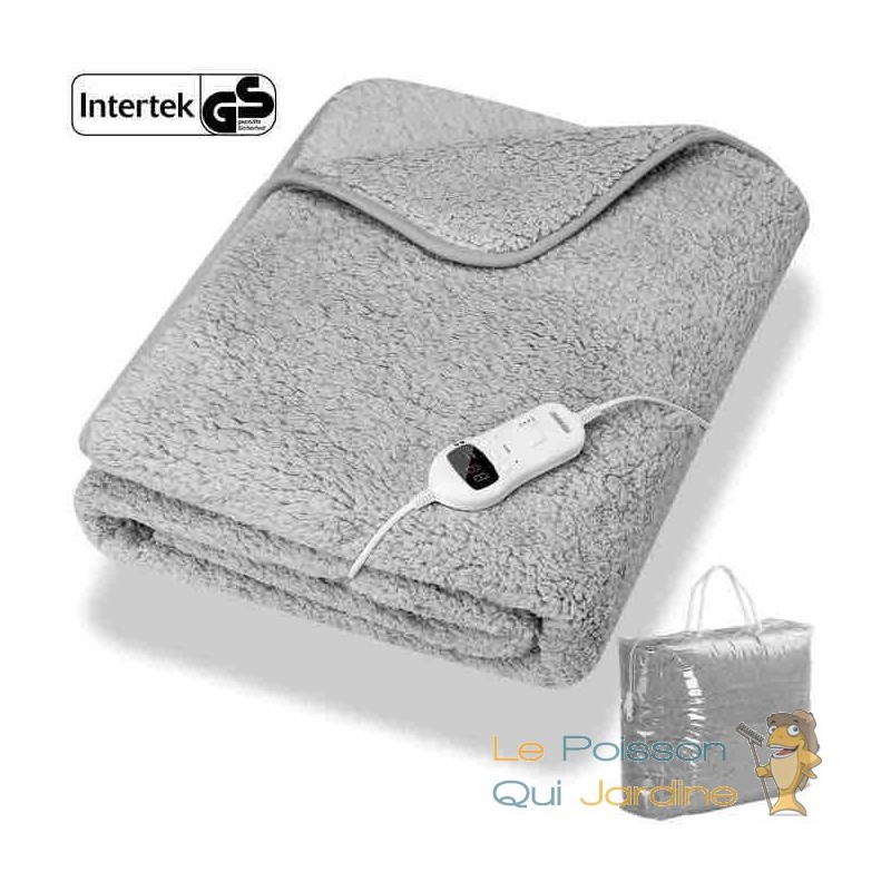 Les avantages de notre produit incluent une certification TÜV SÜD GS, une couverture chauffante avec un temps de chauffe court, une texture ultra douce et moelleuse en polaire Coral lavable jusqu'à 40°. Une commande amovible, neuf niveaux de température, un arrêt automatique, un écran numérique, un câble de 2 mètres, une prise 230V et une protection contre la surchauffe font partie des caractéristiques de cette couverture.