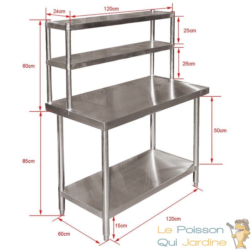 De plus, vous bénéficiez d'un espace de rangement spacieux sous la table, idéal pour stocker tous vos ustensiles en toute commodité. Grâce à un ingénieux système composé de deux étagères placées sur le dessus de la table, vous pouvez optimiser l'organisation de votre espace de travail. Chaque étagère mesure 120 cm de long, 60 cm de hauteur et a une profondeur de 25 cm.
