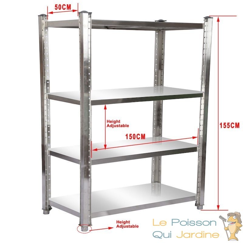 Résistance et durabilité : L'acier inoxydable est un matériau très résistant et durable, ce qui en fait une excellente option pour le stockage de charges lourdes telles que les équipements de cuisine, les ustensiles, les réserves de nourriture, les outils et bien plus encore. Il peut supporter des poids importants sans se déformer ou se casser, garantissant ainsi une longue durée de vie.