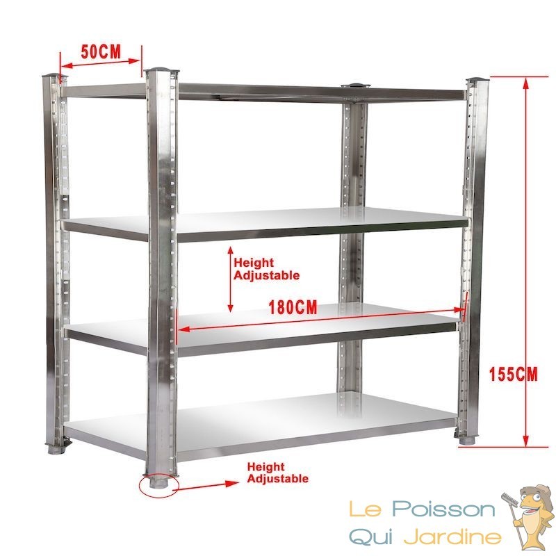Adaptabilité : Les étagères en acier inoxydable sont souvent modulables et peuvent être adaptées en fonction des besoins spécifiques de chaque environnement. Vous pouvez ajuster la hauteur des étagères ou ajouter des accessoires supplémentaires pour optimiser l'espace de rangement en fonction de vos équipements et de vos produits.