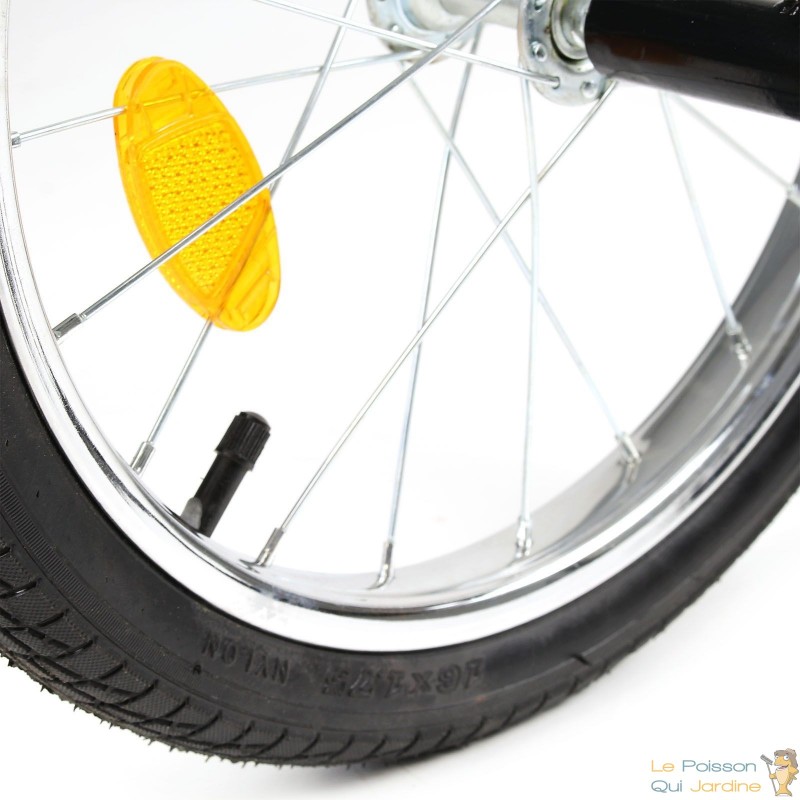 L'attache de la remorque à la zone de la tige de selle se fait facilement grâce à son raccord universel, offrant une fixation sécurisée à votre vélo. Ses pneus d'environ 40 cm (16") sont équipés de deux réflecteurs jaunes pour assurer votre visibilité et votre sécurité lors de vos déplacements, même dans l'obscurité.