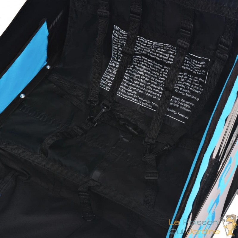 La structure de la remorque est constituée d'un acier exceptionnellement résistant, assurant une durabilité à toute épreuve. Le harnais de sécurité à 5 points intégré garantit une protection optimale pour vos enfants pendant le trajet. Sa conception robuste offre une tranquillité d'esprit aux parents, sachant que leurs enfants sont solidement protégés.