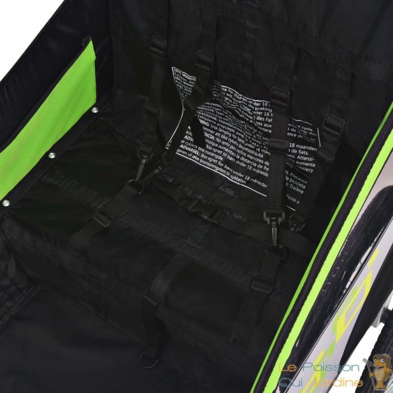 La structure de la remorque est constituée d'un acier exceptionnellement résistant, assurant une durabilité à toute épreuve. Le harnais de sécurité à 5 points intégré garantit une protection optimale pour vos enfants pendant le trajet. Sa conception robuste offre une tranquillité d'esprit aux parents, sachant que leurs enfants sont solidement protégés.
