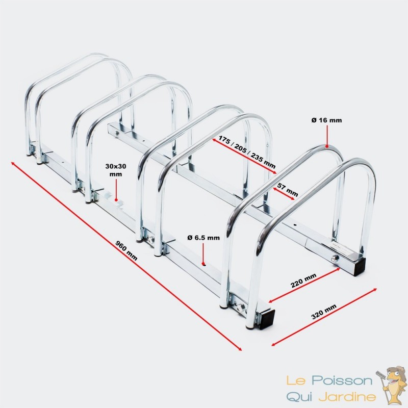 Ici, le râtelier est prévu pour vélos, il est bien sur disponible pour 3 ou 5 vélos avec des dimensions différentes.