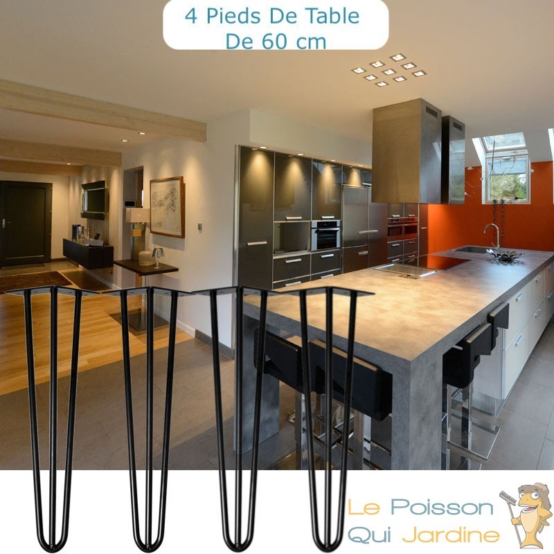 Nous vous proposons 4 pieds de table de 60 cm de hauteur et de couleur noire pour créer des tables de cuisine, de salon ou d'atelier au look moderne et design. La forme de ces pieds de table est une forme d'épingle.