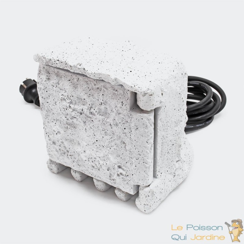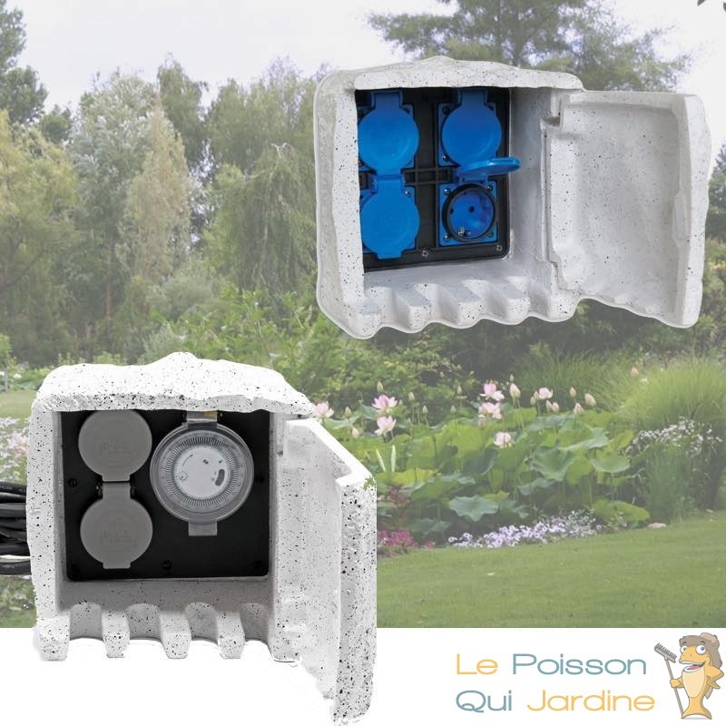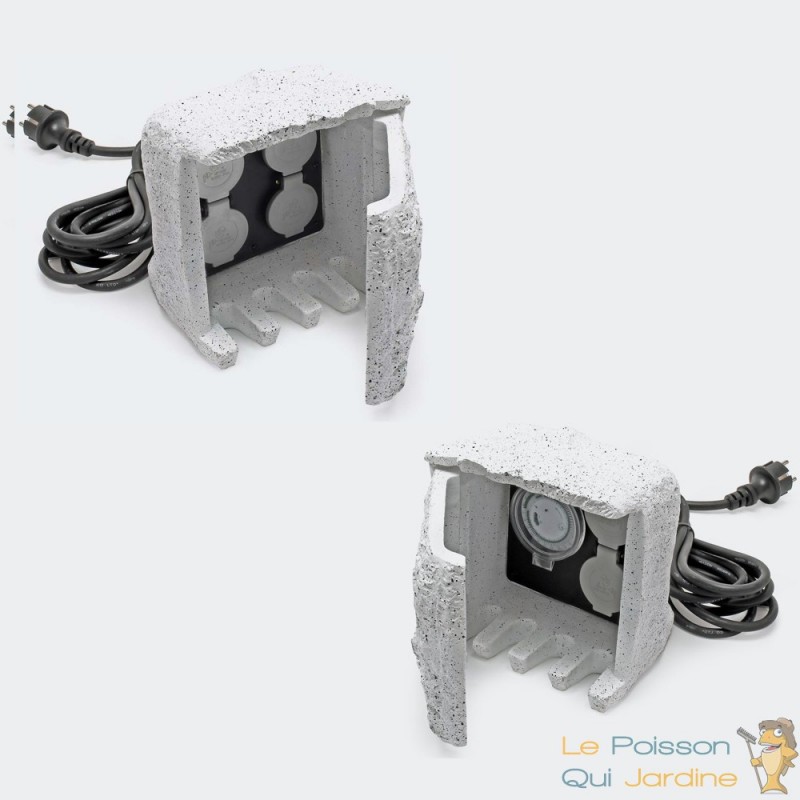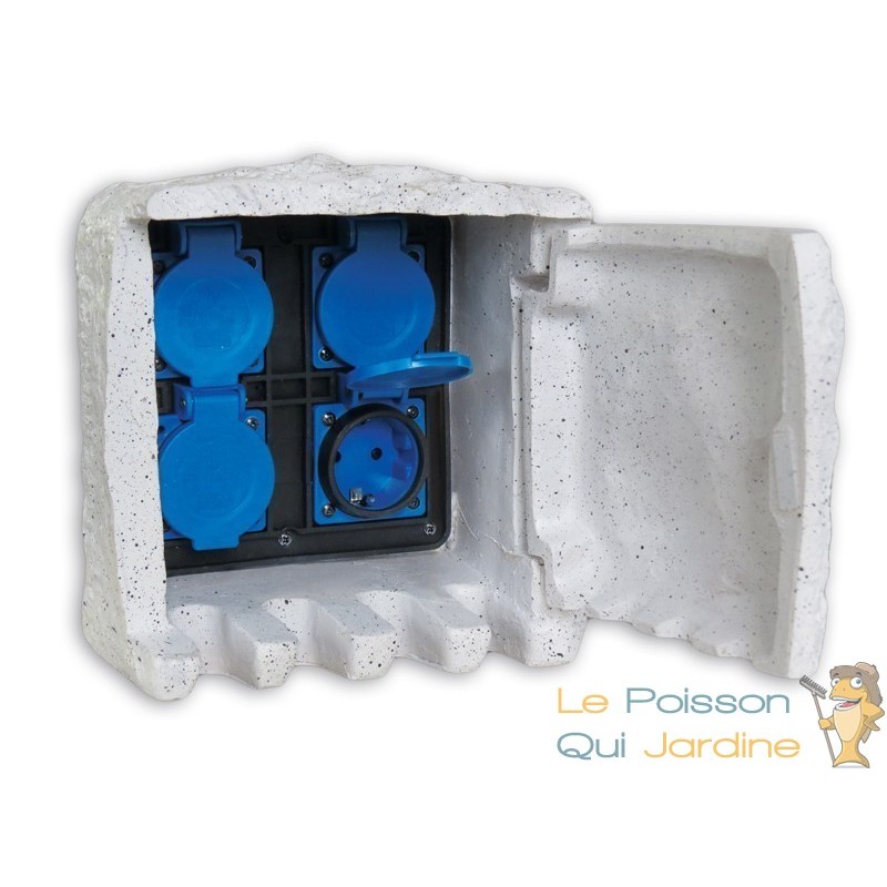 Multiprise étanche pour bassins de jardin et étangs ( 4 prises ) dissimulées dans un coffret imitation pierre.