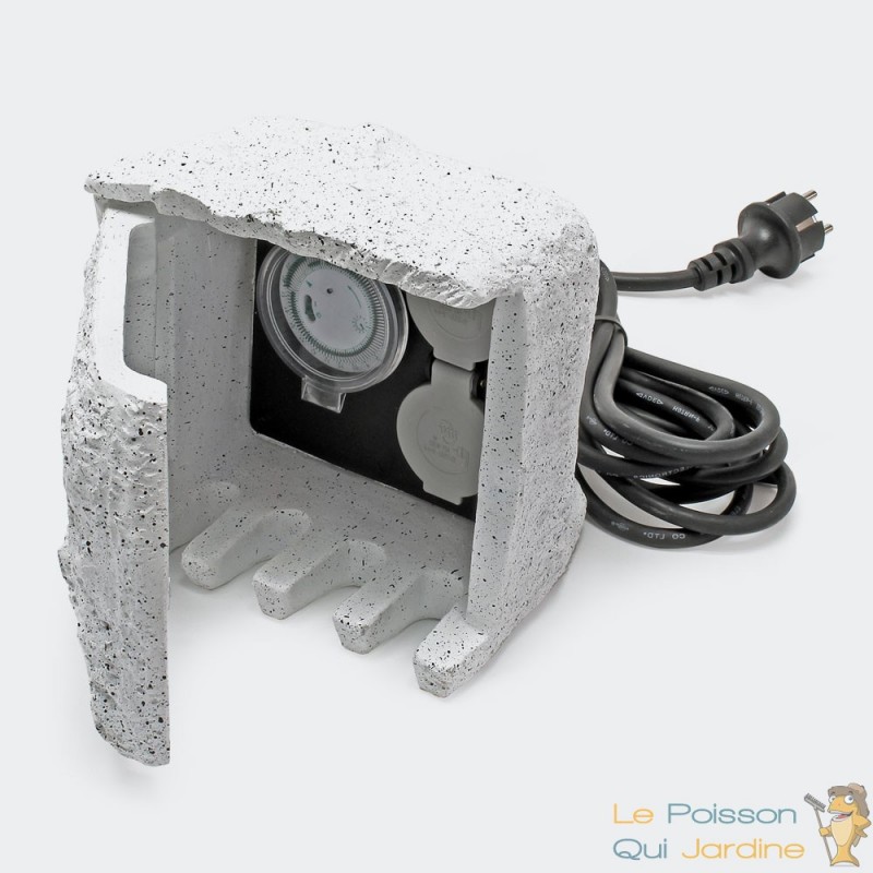 Multiprise étanche pour bassins de jardin et étangs ( 2 prises ) dissimulées dans un coffret imitation pierre ainsi qu'une minuterie.