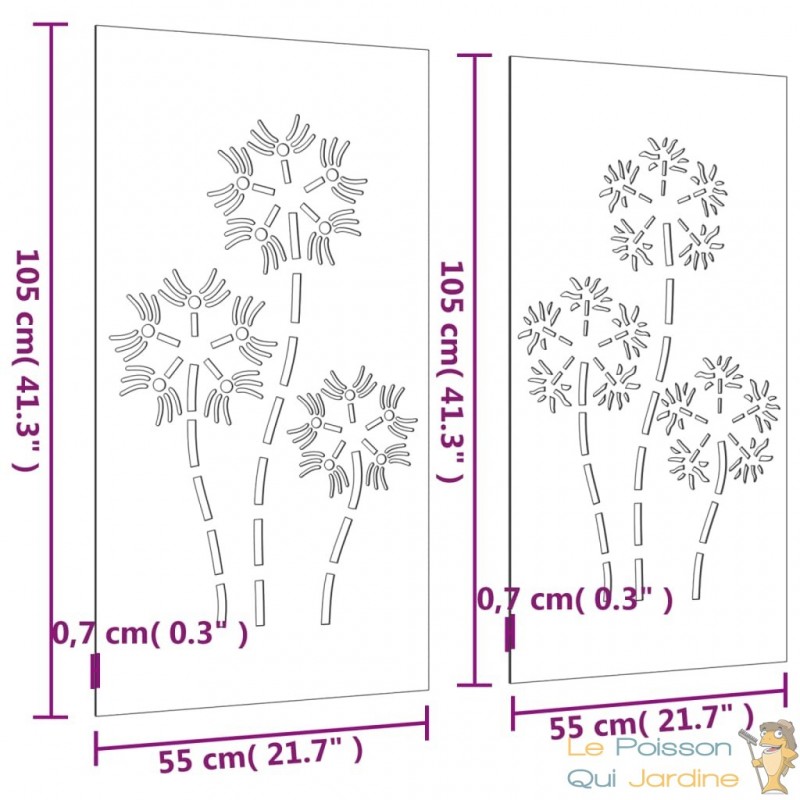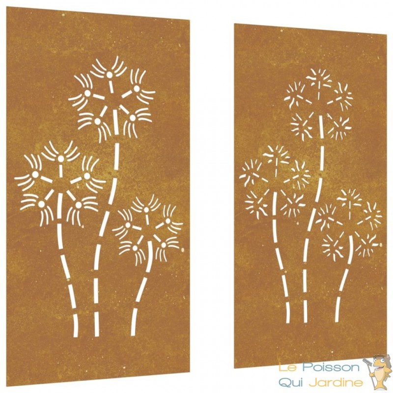 Nos clients sont enchantés par l'idée d'incorporer notre décoration murale de jardin à leurs espaces tels que leur pool house ou leurs abris de jardin. En effet, cette pièce ajoute une dimension d'élégance et de sophistication à ces endroits souvent négligés. Imaginez la transformation instantanée de votre pool house en un espace de détente luxueux, où chaque détail, même le mur, contribue à l'atmosphère raffinée. De même, nos clients adorent l'idée d'embellir leurs abris de jardin avec cette décoration murale, transformant ainsi ces structures fonctionnelles en de véritables joyaux de leur jardin. C'est une manière unique de fusionner la beauté artistique avec l'utilité pratique, créant ainsi un espace extérieur qui inspire et enchante à la fois.Fabriquée à partir d'acier corten, également connu sous le nom d'acier patinable, cette pièce est conçue pour durer. L'acier corten est intrinsèquement anti-corrosif, développant une patine protectrice dès son exposition initiale aux éléments atmosphériques. Vous n'aurez ainsi pas à vous soucier de l'entretenir ou de le repeindre, ce qui vous permettra de réaliser des économies sur les coûts de maintenance à long terme. Sa couleur brunâtre distincte attire le regard et son caractère résistant aux intempéries garantit une durabilité exceptionnelle, défiant le passage du temps.